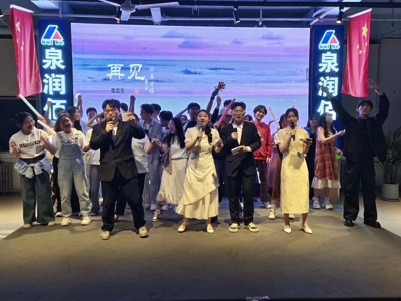 歌舞翩跹庆华诞,欢潮涌动忆征程。激昂音乐奏响,晚会在动感激情的开场舞中开场,舞台上协会成员尽情释放青春活力,灵动舞姿瞬间抓住众人的目光。这不仅是一场视听交织的狂欢,更是一次情感与回忆的深度共鸣。随后,《苏州河》、《其实》等歌曲轮番上演,悠扬旋律与真挚情感交融,勾起协会成员们共同的成长记忆,《新宝岛》、《Lucifer》等舞蹈表演以独特的节奏与舞步展现协会成员的青春风采,《后妈茶话会》、《雷雨》等话剧片段里演员们凭借精湛演技重现经典,相声则用幽默诙谐的语言引得现场欢笑与掌声此起彼伏。其中还穿插抢板凳、听歌识曲等趣味游戏环节,新老会员纷纷踊跃参与,现场气氛热烈欢快。晚会步入尾声,全体成员一同唱响《再见》,荧光棒随着歌声有节奏地挥动,这饱含深情的歌声既是对协会十七年携手共进历程的深情回眸,也寄托着对未来发展的无限美好憧憬。