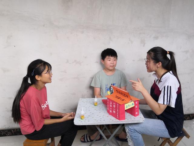“四梁八柱”一词,来源于中国古代传统的一种建筑结构,指靠四根梁和八根柱子支撑着整个建筑。在党的最新理论成果中,“四梁八柱”形象地比喻党的改革要有一个基本的主体的框架。志愿者积极利用网络平台,搜集关于党的“四梁八柱”思想相关内容,制作出标有党的“四梁八柱”思想的十二根纸筒与海报,为确保活动进行时不出一丝纰漏,对于每一根纸筒的释义,志愿者都经过了反复的思考与编排,并熟记于心。本着法律意识要从娃娃培养起的原则,志愿者前往村民家中,以“搭房子”小游戏的形式邀请小朋友一起进行党的“四梁八柱”模型的组装。在游戏进行的同时,志愿者运用通俗易懂的语言,细心地为小朋友讲解,一步步引导小朋友正确地搭建模型。
