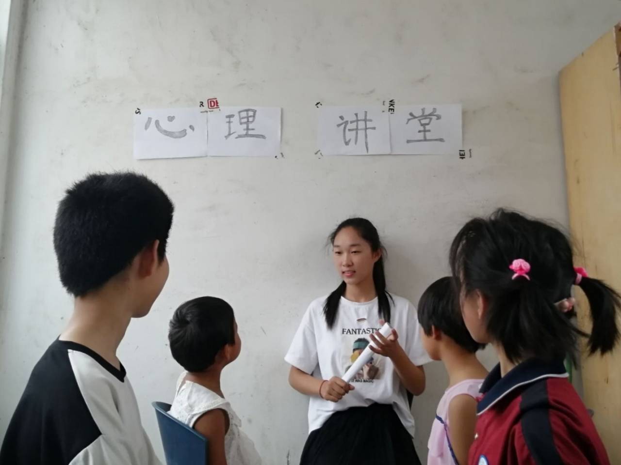 针对孩子们爱玩的特点,志愿者寓教于乐,通过活跃气氛的击鼓传花游戏、考验动手能力的折纸教学、教唱儿歌和手势舞等活动,帮助孩子们打开心扉,增强团队意识。在互动过程中,志愿者发现孩子们普遍存在自卑、胆怯等常见的心理问题,容易封闭自我,极少与他人沟通。为此,志愿者从“心理障碍形成原因与疏解”、“积极向上的乐观心态”和“心理健康知识”等几个方面与孩子们进行了探讨交流,并以身边的真实事例为抓手,帮助孩子们认识到留守生活中的“学习滑坡、自私任性、内心自卑、行为逆反”等现象,鼓励其养成刻苦学习、自强自立、勤劳勇敢的良好性格。