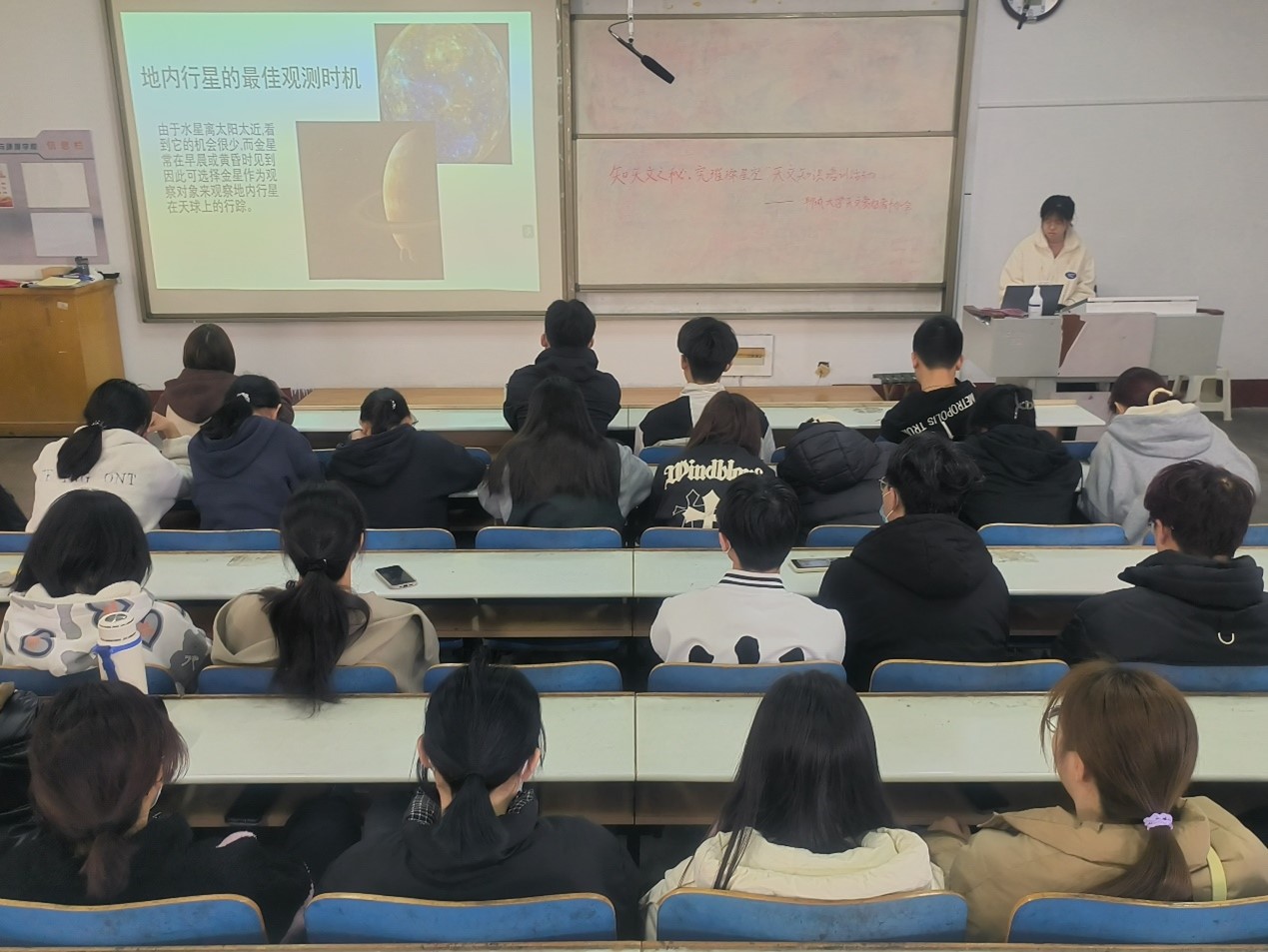 路新颖通过展示太阳系的天体图片,向同学们讲解了太阳、地球、月球三者的相对位置和运行轨迹,并将自己对星空和天体的思考分享给同学们,使大家在交流互动中获得更多知识。