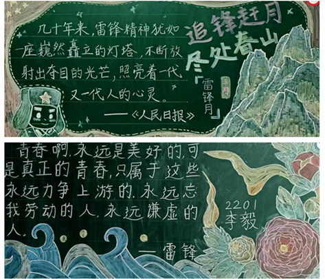二、“向雷锋同志学习”主题文化板报。地理科学师范班团支部以板报的形式营造良好氛围。100多幅板报紧扣主题,文字和图画相得益彰,展现了学子们良好的书写能力、美学欣赏能力和优秀的综合素质。这些板报让同学们在鉴赏的同时,深切感受到志愿服务的精髓,并积极投身到火热的学雷锋实践中去。