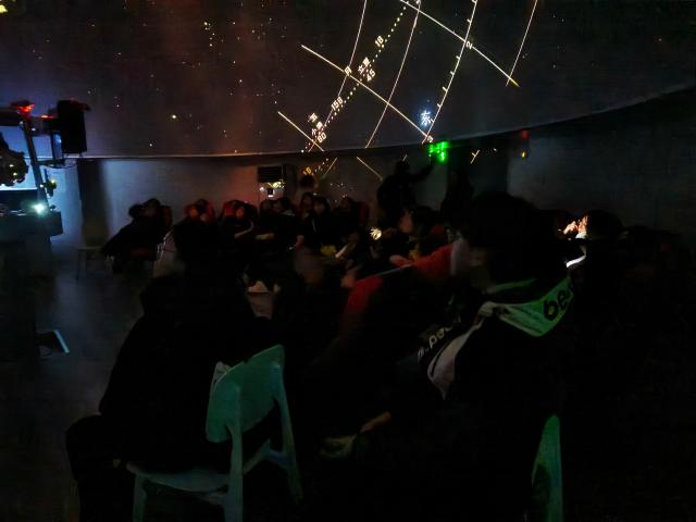 在天象馆,负责人首先介绍了天象馆的基本构造和模拟星空的原理,后用球幕放映向同学们介绍了宇宙的基本知识和星系的构成,帮助同学们建立起了对天文的基本认识。讲解过程中,负责人穿插提问互动环节,鼓励同学们提问和分享自己的天文观测经验。随后,同学们来到日晷广场进行实地观测,在负责人的指导下,同学们使用望远镜对月亮、木星及其卫星进行观测。通过调整望远镜的倍率,同学们观测到了月亮的大体表面,以及木星表面和颜色等。