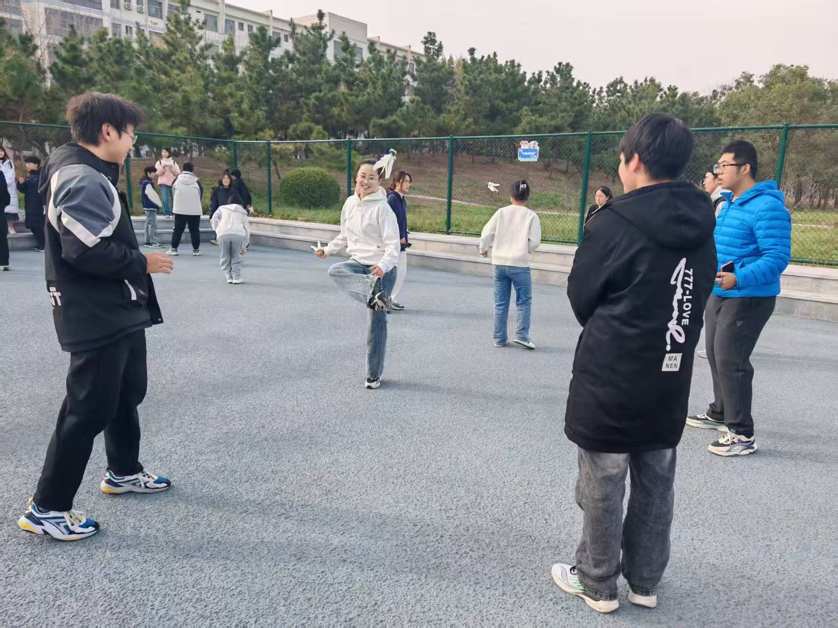 2507班则利用课后各种碎片时间,组建“每日一练”打卡群开展常态化训练。训练内容从单人练习逐步拓展至双人对踢、多人接力等多种形式,期间还即兴发起小型趣味竞赛。简单的运动不仅有效舒缓了学业压力,更在互动中拉近了同窗距离,尽显青春校园的鲜活气息。