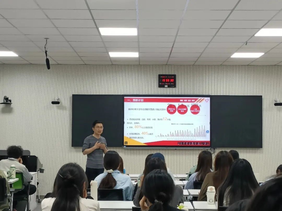 刘杰结合学院历届西部计划的志愿者服务经历,为毕业生解读了西部计划相关政策。首先,他介绍了西部计划服务的八个专项,包括乡村教育、服务乡村建设、健康乡村、基层青年工作、乡村社会治理、卫国戍边、服务新疆、服务西藏,让同学们对西部计划内容有了更加全面的了解和认识。其次,他解说了西部计划项目的报名条件、政策支持和生活保障,鼓励同学们结合自身实际选择未来发展道路,积极参与西部计划。最后,他对同学们提出的问题一一作了解答,排除了同学们的困惑。