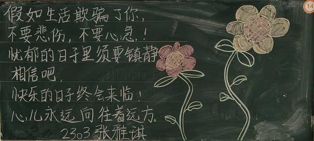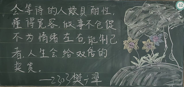精彩纷呈的板书展现了同学们对传统文化的热爱和尊重,启发同学们对生活、自然和人生哲理的深层思考,展现了学院的活力与魅力,传递了学院的精神风貌,营造了积极向上的校园文化氛围。让我们携手努力,共同为打造更加丰富多彩的校园文化贡献力量!