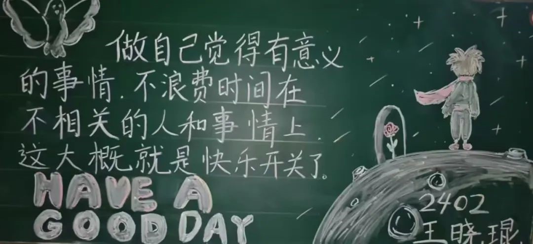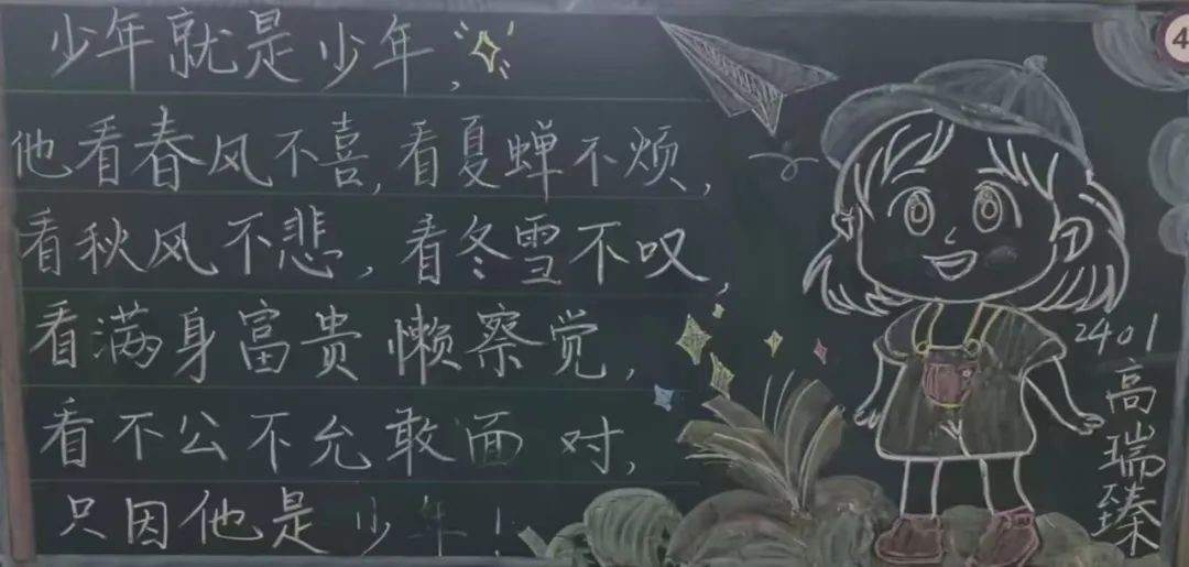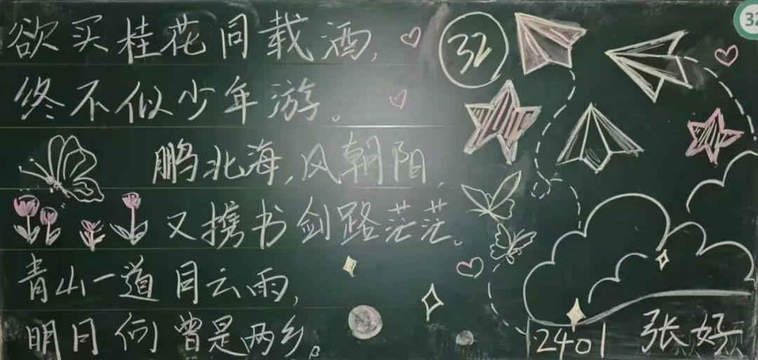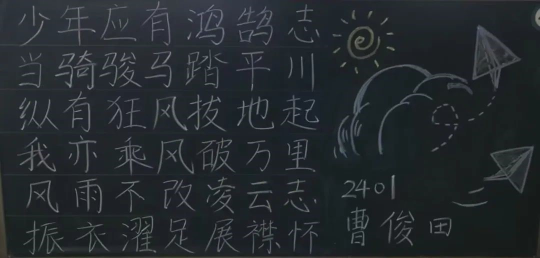 精彩纷呈的板书展现了同学们对传统文化的热爱和尊重,启发同学们对生活、自然和人生哲理的深层思考,展现了学院的活力与魅力,传递了学院的精神风貌,营造了积极向上的校园文化氛围。让我们携手努力,共同为打造更加丰富多彩的校园文化贡献力量!
