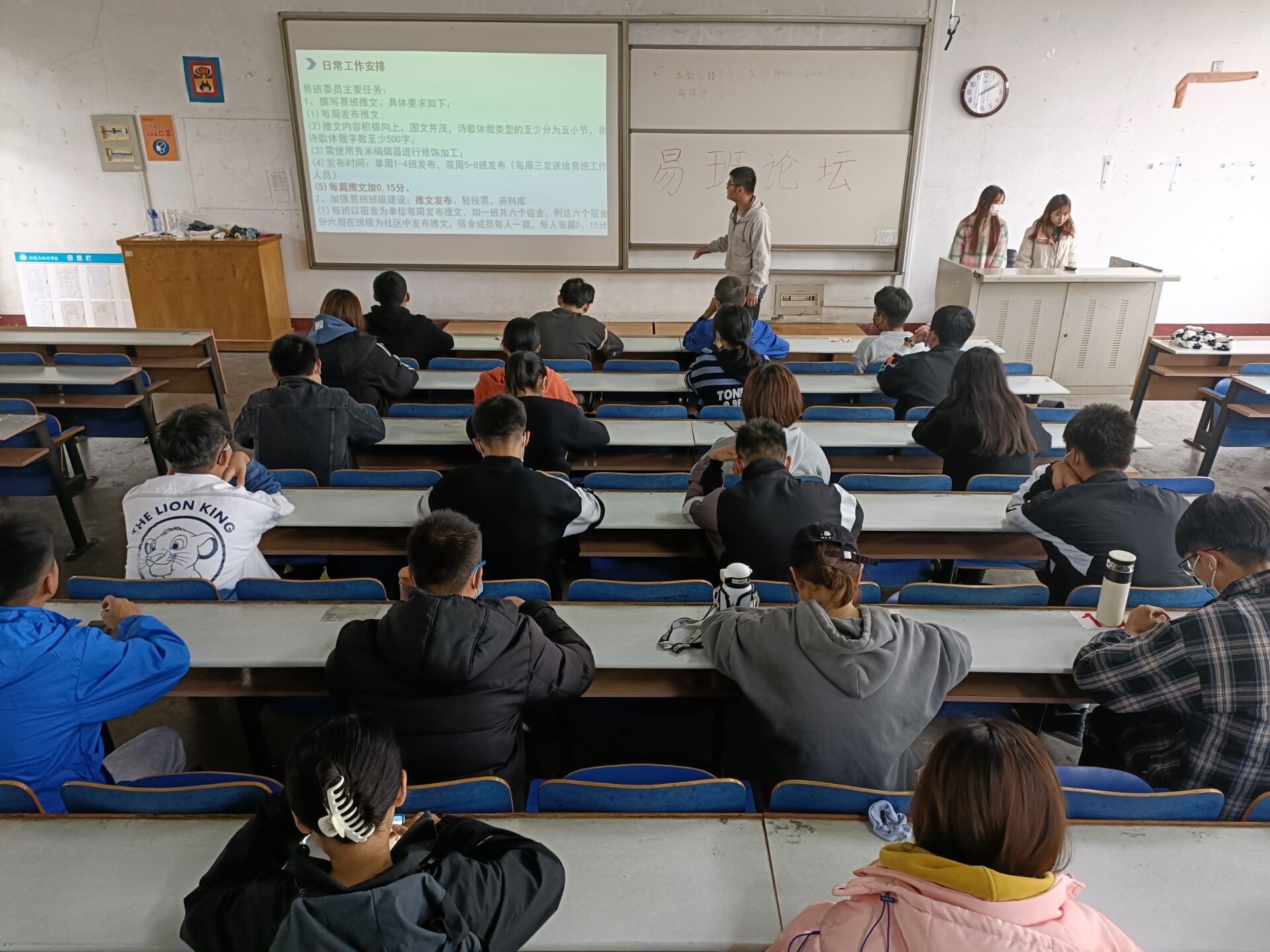 易路发展,共同前进。在活动过程中,凭借PPT内容,张灿银向同学们讲解了易班APP推文的注意事项,鼓励同学们积极参与点赞评论。李晓倩向同学们介绍了易班APP推文的具体制作方法以及制作过程中所需要用的软件,向各班易班委员说明了每班每月规定的推文数量和班级推文工作建设,为同学们日后的易班工作奠定了坚实的基础。李铭阳向同学们详细介绍了班级推文的加分准则和推文发布过程中可能遇到的问题,并为如何解决这些问题做了讲解。此外,李铭阳围绕易班轻应用、易班网薪、易班优课及资料库等板块的相关运用,向同学们宣讲了具体内容,充分展现了易班平台线上学习方面的独特优势。易班发展中心成员们细致耐心的讲解,使同学们对易班APP有了更加深刻的认识。论坛中,同学们积极参与、热烈讨论,论坛取得圆满成功。