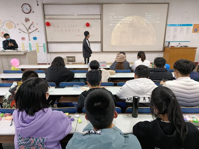 天文模型制作大赛以小组合作的形式展开,各参赛者小组需共同完成模型制作、PPT制作、模型讲解三部分内容。各参赛组借助橡皮泥、木棒、卡纸、黏土等材料进行模型制作,同时利用PPT演说,将其模型作品的原理及构造生动描绘出来。围绕类地行星模型,王天宇组向同学们详细地介绍了太阳系中类地行星的相关知识,增加了同学们的天文知识储量。黄宇欣组将目光聚焦在太阳、土星、地球、火星等天体上,制作的模型外部构造简单大方,内部却不失精致,形象地展现出各星体的特征。刘艳琴组在制作模型时独辟蹊径,以蓝色纸板做星空,周围点缀行星和宇航员模型,宇航员手持五星红旗,表达了向宇宙探索的坚定信念,意义深刻。经评定,赵鑫、朱丽、刘艳琴获得一等奖。