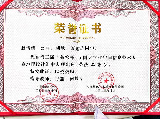 热烈祝贺我院学子荣获第三届“苍穹杯”全国大学生空间信息技术大赛分析组二等奖