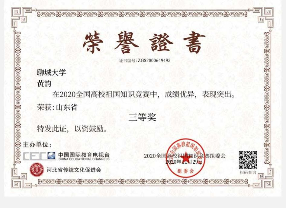 黄韵在2020年全国高校祖国知识竞赛中获得三等奖