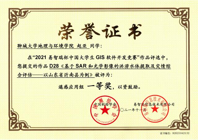 赵亚在2021易智瑞杯中国大学生GIS软件开发竞赛中获得一等奖