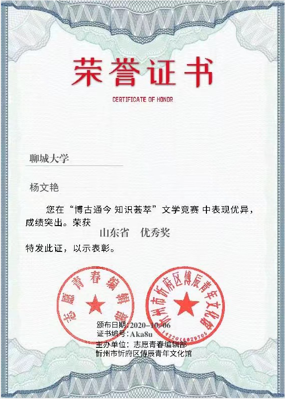 杨文艳在“博古通今知识荟萃”文学竞赛中获得山东省优秀奖