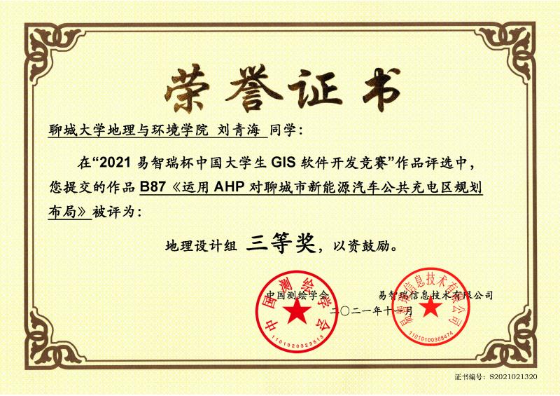 为提高科技创新意识,2021年11月,英国上市365刘青海参加了2021易智瑞杯中国大学生GIS软件开发竞赛,获得三等奖。