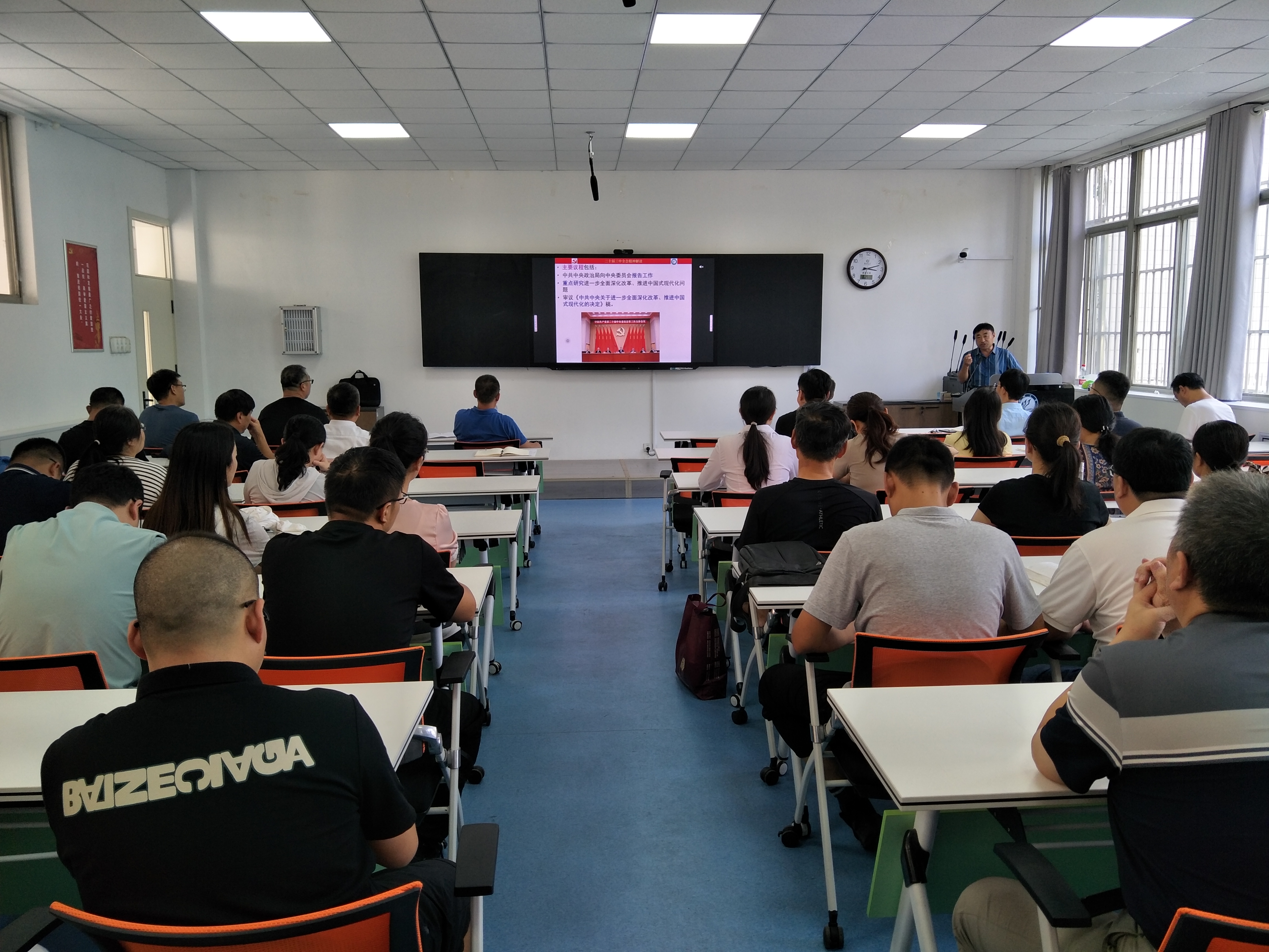 为全面深入学习宣传贯彻党的二十届三中全会精神,8月29日下午,英国上市365举行党的二十届三中全会精神宣讲报告会。党的二十届三中全会精神宣讲团成员秦正为教授以《进一步全面深化改革 推进中国式现代化——二十届三中全会精神解读》为题作宣讲报告。学院党政领导班子成员、党支部书记、系主任、学科带头人、专业教师、辅导员、班主任等共78人参加宣讲报告会。宣讲报告会由学院党委书记井岗主持。