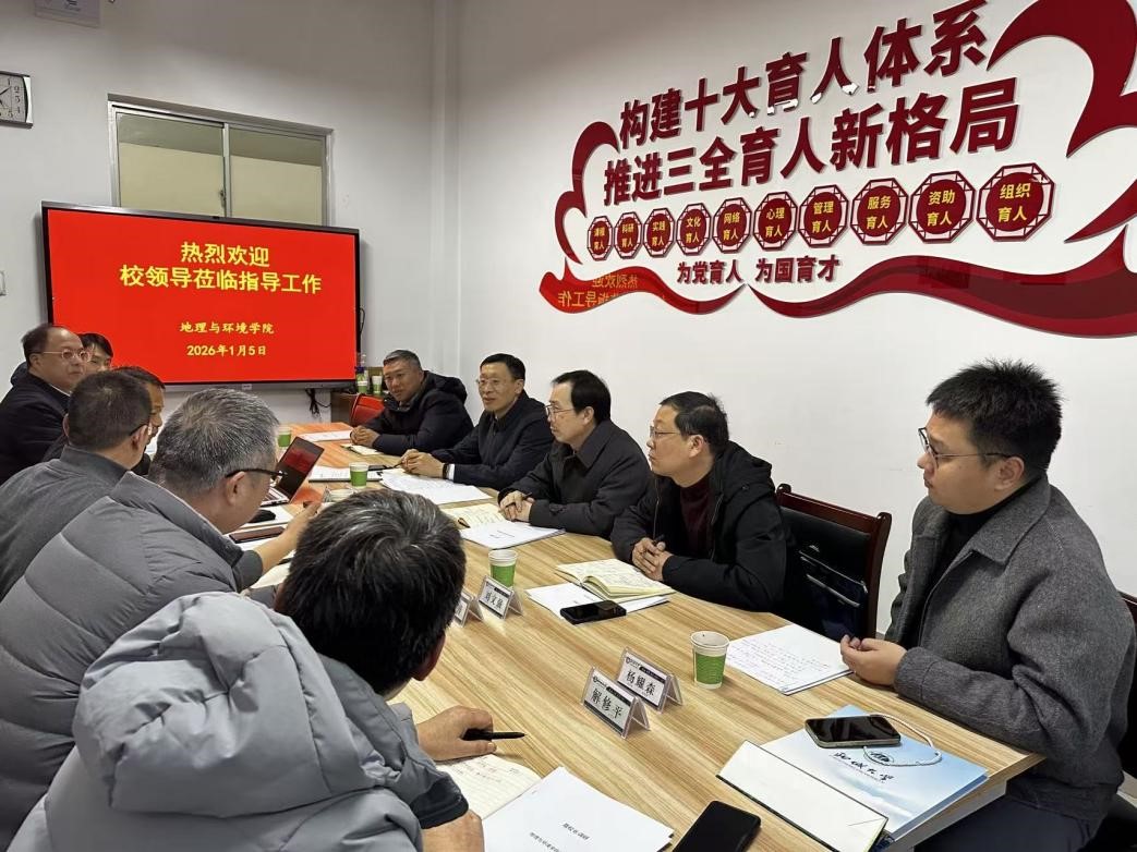 听取汇报后,聂广明对学院近年来在人才队伍建设、科学研究以及服务区域发展等方面的工作给予充分肯定。他指出,地理学、环境科学具有鲜明的交叉属性和现实需求特征,要聚焦国家重大战略和区域发展需求,进一步凝练优势方向,突出特色、发挥优势,持续提升学科影响力与贡献度;要强化目标导向和问题导向,完善科研组织机制,促进高水平团队建设与青年人才成长;要注重成果转化与社会服务,把科研优势转化为支撑地方高质量发展的实际成效。