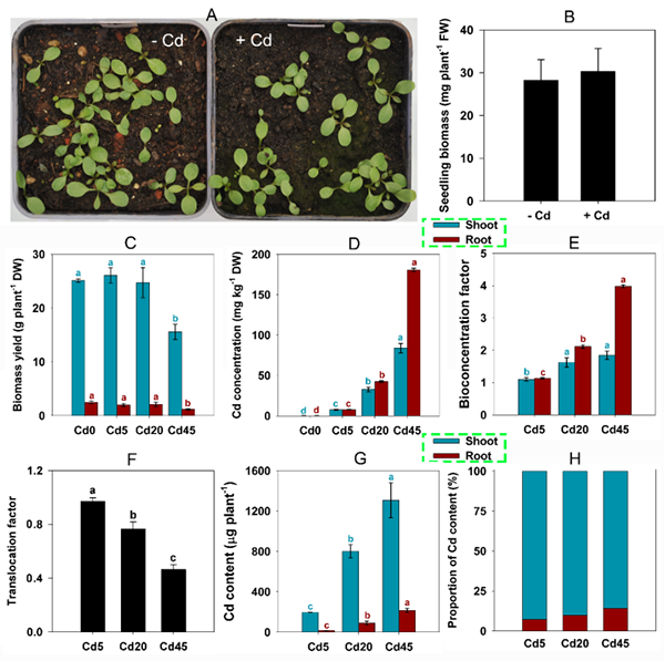 研究人员在筛选过程中发现大花金鸡菊(Coreopsis grandiflora)对重金属Cd具有较强的耐受性,能在20 mg/kg左右的土壤Cd浓度下生长良好。在5-45 mg/kg的土壤Cd浓度下的地上部分Cd富集系数(1.09-1.85)和Cd转运系数(0.46-0.97)表明大花金鸡菊是一种Cd富集型植物(图1),可以考虑用于土壤Cd污染的植物修复。在20 mg/kg土壤Cd胁迫下,大花金鸡菊体内的抗氧化酶(比如SOD、POD和CAT)和多种游离氨基酸(包括Pro、His和Met等)被显著诱导参与Cd解毒。在植物根际,多种微生物类群的丰度在Cd污染下显著改变,这种变化和土壤pH、Cd或有效钾(K)浓度紧密相关。多种植物生长促生微生物类群(Nocardioides, Flavisolibacter, Rhizobium, Achromobacter和Penicillium等)在Cd胁迫下显著富集,这些微生物类群可能有助于维持Cd胁迫下大花金鸡菊的生长和活力,其中Rhizobium, Achromobacter和Penicillium等类群可能直接影响植物对Cd的吸收。此外,Rhizobium和 Penicillium等潜在的解K菌还可能参与了土壤中K的活化,从而调控植物对Cd的吸收。该研究从植物生理和根际效应方面解析了大花金鸡菊耐受和富集Cd的潜在机制,研究结果以Physiological and rhizospheric response characteristics to cadmium of a newly identified cadmium accumulator Coreopsis grandiflora Hogg. (Asteraceae)为题,发表在Ecotoxicology and Environmental Safety上。