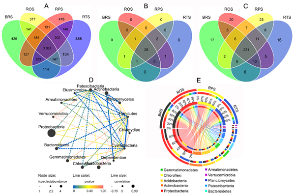 图2.未种植植物的土壤(BRS)和3种大黄根际土壤(ROS、RPS和RTS)中细菌群落多样性组成