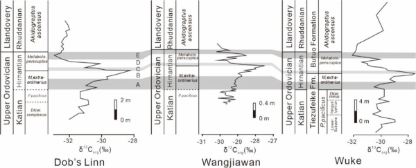 晚奥陶世末期,受沉积相控制,我国华南地区主要发育富有机质黑色页岩,仅在赫南特期短暂发育少量碳酸盐岩沉积。而乌科剖面,不仅出露了连续的上奥陶统碳酸盐岩地层,还保存了典型的晚奥陶世浅水底栖生物的化石、生物绝灭后的微生物岩(凝块石、核形石等),以及冰期后的暖水生物(图1)。在此基础上,研究人员将乌科剖面上奥陶统顶部识别出的(七个)典型沉积旋回与具有良好笔石生物带约束的深-浅水过渡剖面“万和”剖面的旋回一一对照,同时结合碳同位素地层学(图2),准确建立起乌科剖面上奥陶统时间地层格架,为后续在华南地区对LOME时期生物与环境相互作用的研究打下了基础。
