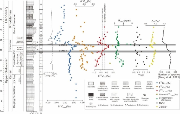 针对上述问题,中国科学院地质与地球物理研究所研究人员与美国耶鲁大学、斯坦福大学和中国地质大学(武汉)研究人员合作,在华南川滇交界的大凉山腹地,寻找到了完整记录晚奥陶世末生物幕式演化的连续浅水碳酸盐岩剖面——“乌科”剖面,但由于奥陶系-志留系界线地层序列是基于浮游型笔石生物带确定的,与缺乏笔石的浅水碳酸盐地层对比就存在很大困难。为此,他们通过古生物演化序列及与典型界线剖面旋回地层和碳同位素地层的对比,建立了该剖面奥陶系-志留系界线地层格架,并通过铀同位素地球化学变化和数值模拟,明确了LOME时期全球海洋缺氧面积变化与生物演化和衰落的关系。