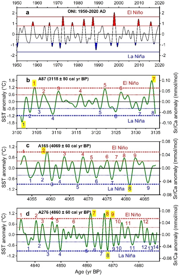 图1 (a) ONI:1950年1月至2020年2月。亚化石鳞砗磲A87 (b)、A165 (c)和A276 (d)的Sr/Ca-SSTA重建的ENSO活动。细直线/虚线和粗直线/虚线分别表示“中度”和“强”厄尔尼诺和拉尼娜现象。极端厄尔尼诺-拉尼娜事件以黄色阴影数字标记。