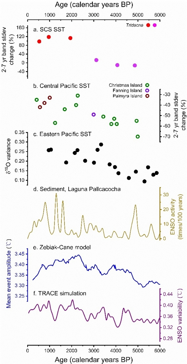 为了进一步探讨中晚全新世的ENSO变率,该研究还集成了来自南海北部已发表的所有亚化石砗磲Sr/Ca序列。重建结果表明,从中全新世到晚全新世ENSO变率逐渐增加,这样的变化趋势也可以从一些古气候重建的ENSO变率中得到验证,如来自Laguna Pallcacocha drainage的沉积岩心,中太平洋集成的珊瑚δ18O序列及东太平洋有孔虫δ18O序列。此外,一些模式的模拟结果也预测了中晚全新世逐渐增强的ENSO变率,这可能是由于轨道变化引起的太阳辐射改变造成的。