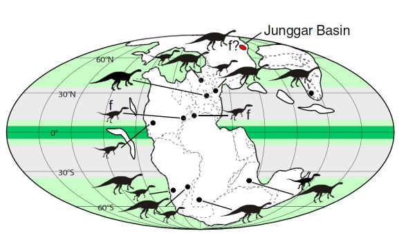 图1.晚三叠世准噶尔盆地古地理位置及恐龙分布图