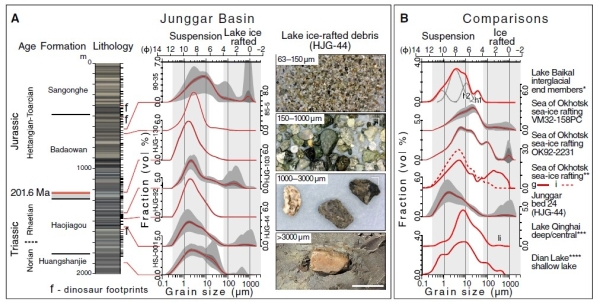 晚三叠世至早侏罗世早期是地球历史上典型的温室时期,大气二氧化碳浓度达到1000-6000 ppm,地球两极不存在冰川,森林覆盖到达潘吉亚大陆的南北两极。科研团队重新校正了准噶尔盆地的古纬度,认为其晚三叠世至早侏罗世位于潘吉亚大陆的北极地区(~71゜N)。研究团队首次在准噶尔盆地晚三叠世至早侏罗世深湖相泥岩中发现了冰筏沉积,其主要特征是砂粒或小砾石(0.1-15 mm)漂浮于泥岩(0.1-63 μm)中,粒度分析结果呈明显的双峰式。冰筏沉积可能是由于冬季靠岸湖水结冰时冻结湖底的砂砾,春季湖冰融化,一部分冰携带冻结的砂砾漂浮至湖中央,至完全融化后将其释放而沉积于深湖泥中;也可能是冬季风将陆地上的砂砾吹至冰面,春季湖冰融化,砂砾落入深湖泥中。准噶尔盆地冰筏沉积的发现指示了即使在两极无冰川的温室地球时期,极地也存在季节性的结冰(零下)。 科研人员首次在准噶尔盆地晚三叠世至早侏罗世湖沼相泥岩中发现了保存精美的恐龙脚印化石,表明晚三叠世至早侏罗世恐龙生活于极地地区,并适应极地季节性的严寒气候(零下结冰)。