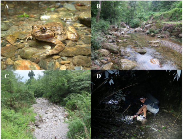 中国科学院成都生物研究所研究员胡军华团队针对上述问题与保护需求,以棘腹蛙(Quasipaa boulengeri )为指示物种开展了系统的野外调查与研究。棘腹蛙是广泛分布在四川盆地周边山区和南部省份的中国特有种。因其求偶时发出的“梆、梆”声,常被称为“梆梆鱼”、“石梆”;又因其常伏于溪中石下不易辨别,在一些地区也被称为“石坑”、“石蛙”。近几十年来,由于持续的栖息地丧失和过度捕捉等原因,棘腹蛙种群数量急剧下降,已被国际自然保护联盟列为濒危物种。