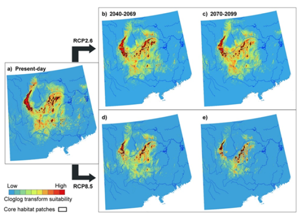 图2 气候变化背景下棘腹蛙适宜栖息地与核心斑块的空间格局