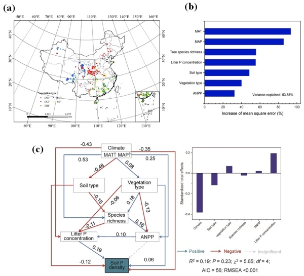 图1 (a)研究样点分布图;(b)随机森林模型;(c)调控土壤磷密度格局的结构方程模型