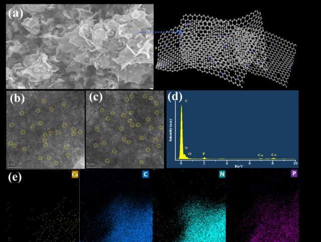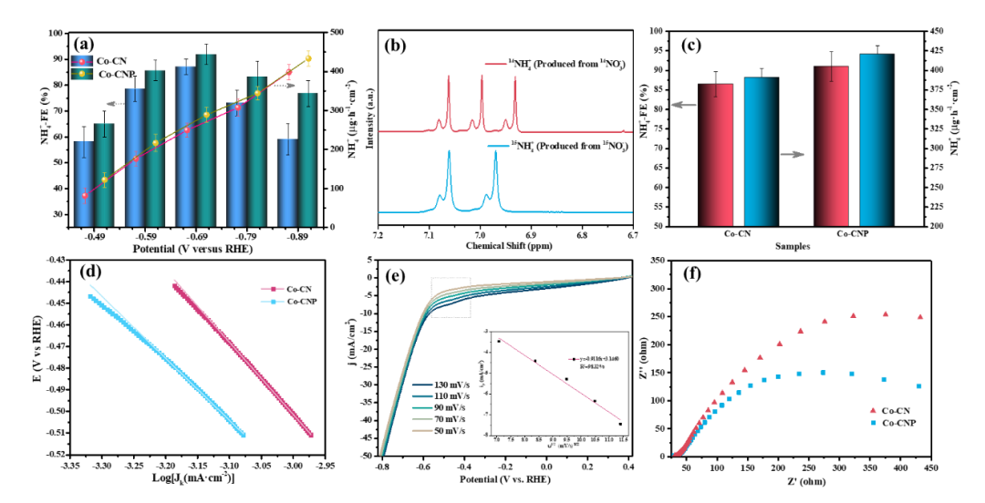研究团队采用自然界极少的15NO3−作为氮源,以同位素标记法进一步证明了氨生成的唯一氮来源为硝酸盐。利用1H核磁共振(NMR)仪对产生的氨进行检测,14NH4+和15NH4+的核磁谱图分别具有典型的三峰和双峰结构。研究采用多种实验分析手段对载体结构进行了分析。结果表明,磷的掺杂进一步提高了碳氮载体的缺陷程度,提供了更多的固定位点负载单原子钴,并且缺陷位点会对相邻金属钴活性位点的电子结构和性能产生影响,提高了电极导电性。