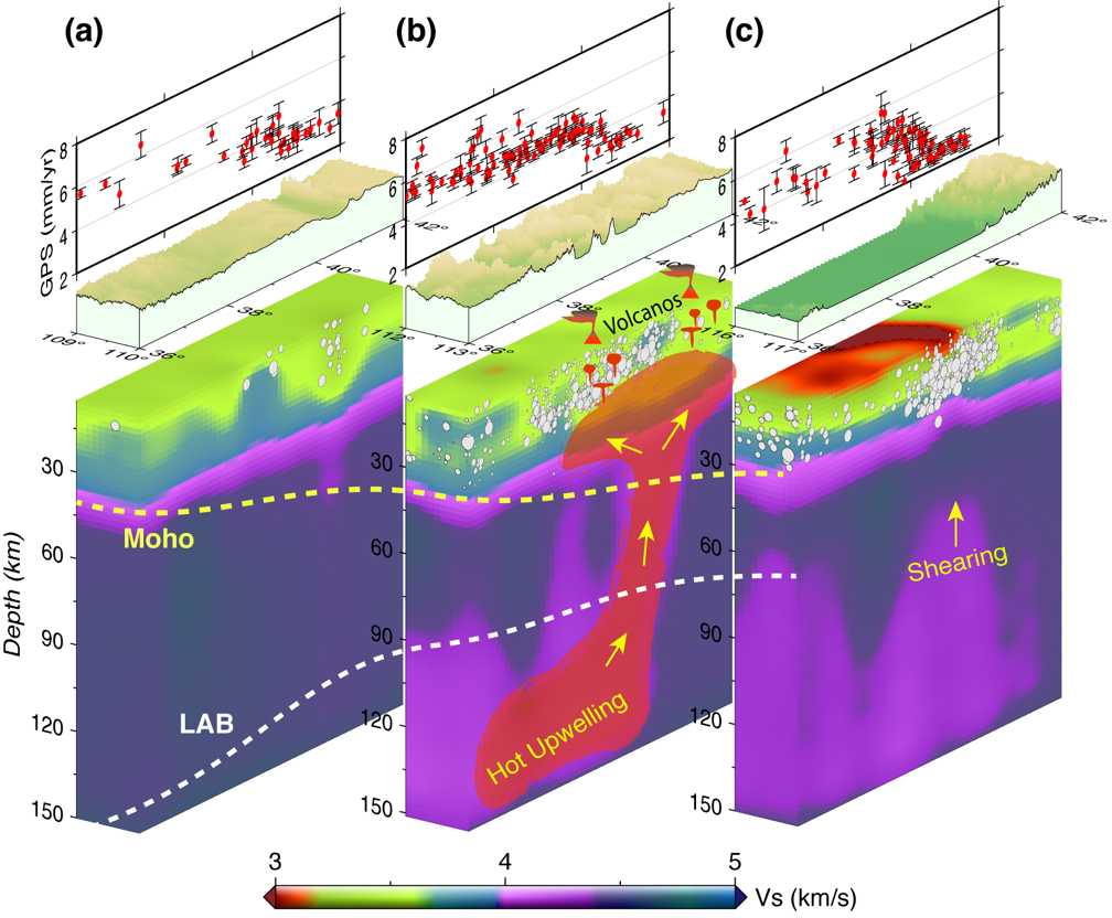 图2.(a-c)华北克拉通从东到西的三条速度结构剖面。顶部图展示了沿剖面的GPS速度场的东西分量,中间图展示了三维地形,底部三幅图展示了横波速度结构成像结果。白色圆点代表地震分布,黄色和白色虚线指示由横波速度结构得到的地壳和岩石圈深度。红色区域和黄色箭头指示热的软流圈物质上涌,并最终导致岩浆底侵和新生代玄武岩火山。