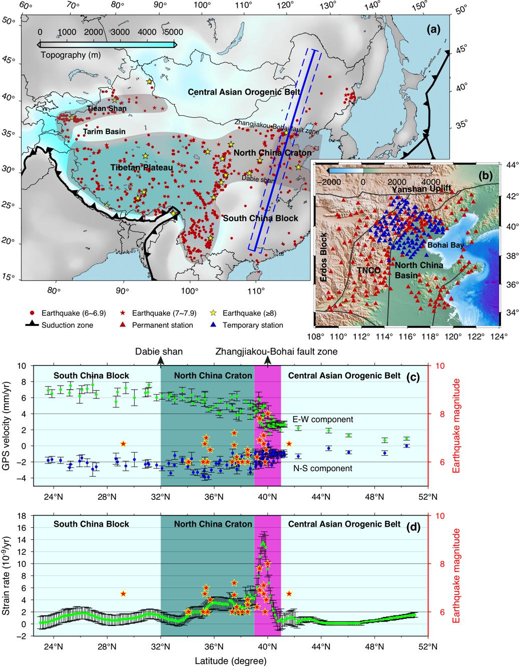 图1.(a)平滑后的地形图和中国境内大地震分布,阴影区域代表地震活动密集区域。图中蓝色实线和虚线框指示了c和d图展示的剖面位置。(b)研究使用的地震台站分布图,图中黑线表示华北克拉通主要构造边界位置。(c)为沿a图中蓝色实线的地表GPS速度剖面(Wang & Shen, 2020。参考文献见论文正文),绿色和蓝色点分别代表GPS速度的东西和南北分量,黄边红色五角星代表震级大于6的地震事件。(d)为沿a图中蓝色实线的应变率剖面。