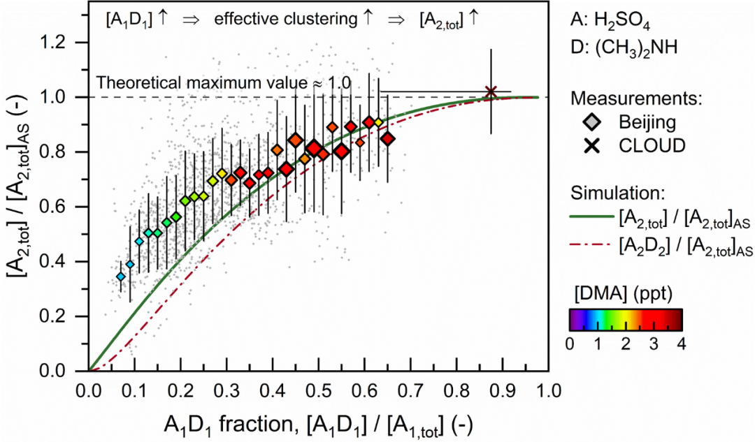 然而,所测得的酸碱团簇中碱性分子数量均小于硫酸分子数量,且碱性分子最早出现于含两个硫酸的团簇中。故曾有理论认为,气态硫酸转化为新粒子需首先生成硫酸双分子团簇,而碱性分子与硫酸双分子团簇的结合是决定新粒子生成速率的关键步骤。