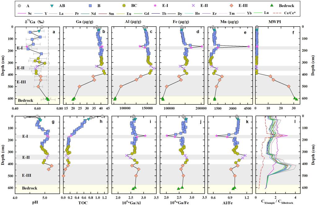 为了衡量镓及其同位素追踪大陆风化的潜力,天津大学地科院陈玖斌团队选择中国广东雷州半岛玄武岩发育的强风化砖红壤剖面,开展镓同位素组成特征和分馏机理研究。研究结果表明,风化剖面中的镓倾向存在于残留相中的富铝矿物(如,粘土矿物)和富铁矿物(如,铁氧化物)中。该剖面风化过程中,较轻镓同位素(69Ga)被优先保留在风化产物中,而较重镓同位素(71Ga)则被淋滤进入流体,并受风化过程中富铝和富铁矿物的变化共同控制。重要的是,砖红壤的δ71Ga值在整个剖面中的变化显著大于其Ga/Al比值的变化,表明δ71Ga值在示踪地表风化过程的应用中比镓浓度和Ga/Al比值更敏感。此外,研究结果还显示,环境氧化还原条件可能会对镓同位素分馏产生影响,如富铁/锰层(E-I层)和铝矿物层(E-II层)中镓同位素组成的显著变化,预示镓同位素可能是一种有用的古环境示踪剂。