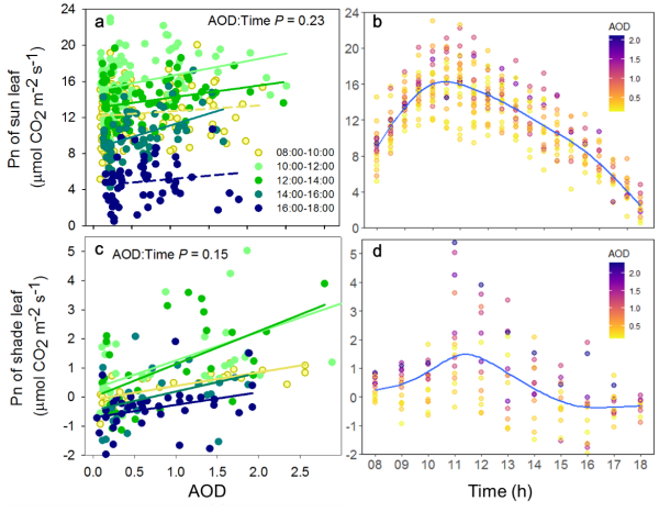 气溶胶对阳生叶(a、b)和阴生叶(c、d)光合作用日动态的影响