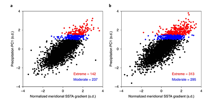 图1. 20世纪历史气候情景(a)和21世纪未来变暖情景(b)下大西洋ITCZ极端摆动事件(红点)