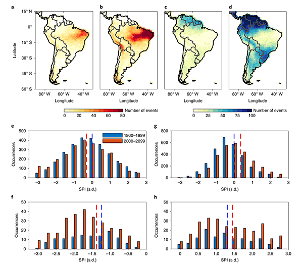 图2. 20世纪历史气候情景和21世纪未来变暖情景下,由大西洋ITCZ极端摆动事件所导致的极端干旱(a,b,f)和极端降雨(c,d,h)事件的发生频率直方图