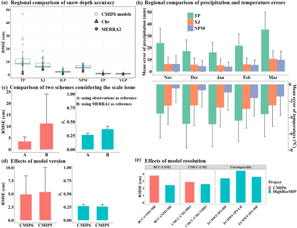 图2 雪深精度的区域对比(a)以及其他因素对评价结果的影响,如降水和气温误差(b)、尺度效应(c)、模型版本(d)和模型分辨率(e)。TP:青藏高原;XJ:新疆;ILP:内蒙古和黄土高原;NPM:东北平原和山地;EP:东部平原;YGP:云贵高原。