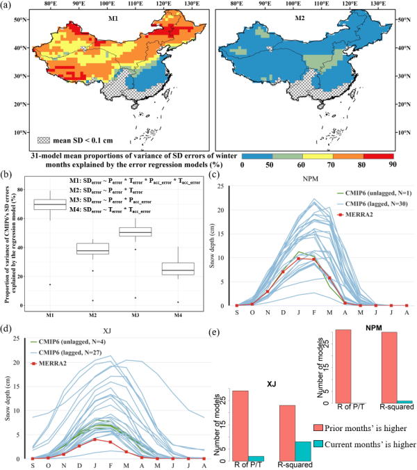 降水和气温误差是导致CMIP6模型在中国雪深误差较大的主要因素,且前期累积误差具有重要影响:同时考虑了当前月和前期累积降水与气温误差的雪深误差回归模型(M1)的调整后R2(adjusted R-squared)显著高于只考虑当前月降水和气温误差的回归模型(M2),且前者对CMIP6中国雪深误差的网格平均解释度超过了65%(图3a-b)。