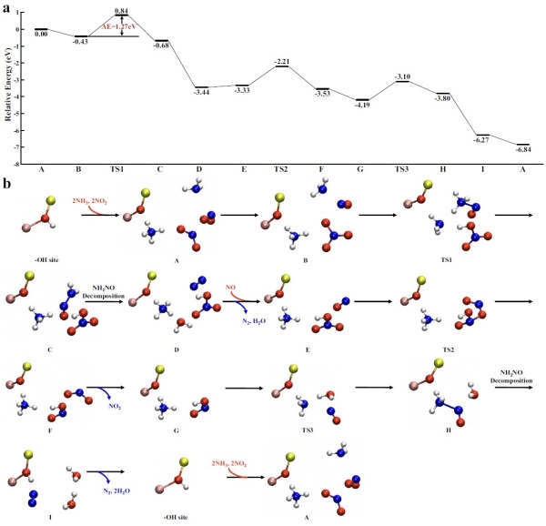 图2.Brnsted酸性位点上的快速SCR反应模拟计算。a.吉布斯自由能,b.基元反应中反应物、过渡态和产物的优化结构。
