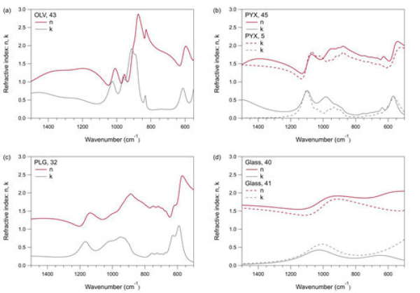 在行星光谱学研究中一直存在一个难题,就是实验室测量的光谱与遥测光谱之间往往存在较大差异,因为即使有了月壤样品,在实验室内也无法完全复制月表原始的堆积状态。因此实验室测量光谱往往无法直接应用于遥测数据的解译上,尤其是显微光谱分析结果。而通过反演光学常数(或折射率)的方式,可以将实验室测量结果与遥测分析很好的衔接起来。光学常数是光谱模型的重要输入量,有了不同矿物端元的光学常数,再结合给定的颗粒尺寸、孔隙度及各端元的含量等参数,就可以生成模型光谱。利用该模型对实际遥测月表光谱进行拟合,就可以实现对观测区域矿物组成的定量反演。目前的光学常数库中,基于真实地外样品的光学常数还比较匮乏。虽然地球上的矿物种类非常丰富,但是与地外样品相比,即使是同种类的矿物,其在具体成分上也存在一定差别。比如地球上的橄榄石大多Mg含量比较高,而月球上的橄榄石通常Mg含量比较低。因此,尽可能的扩充基于真实地外样品分析得到的光学常数库是很有必要的。该研究中,研究人员基于显微红外反射光谱,对挑选出的一些典型橄榄石、斜长石、辉石及玻璃端元的光学常数进行了反演(图4),这些结果将对现有的或将来的月球及其他小行星的光谱分析产生很大帮助。