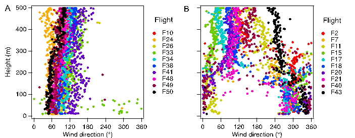 图1 无河陆风条件下(A)和有河陆风条件下(B)河流上空水平风向垂直分布情况