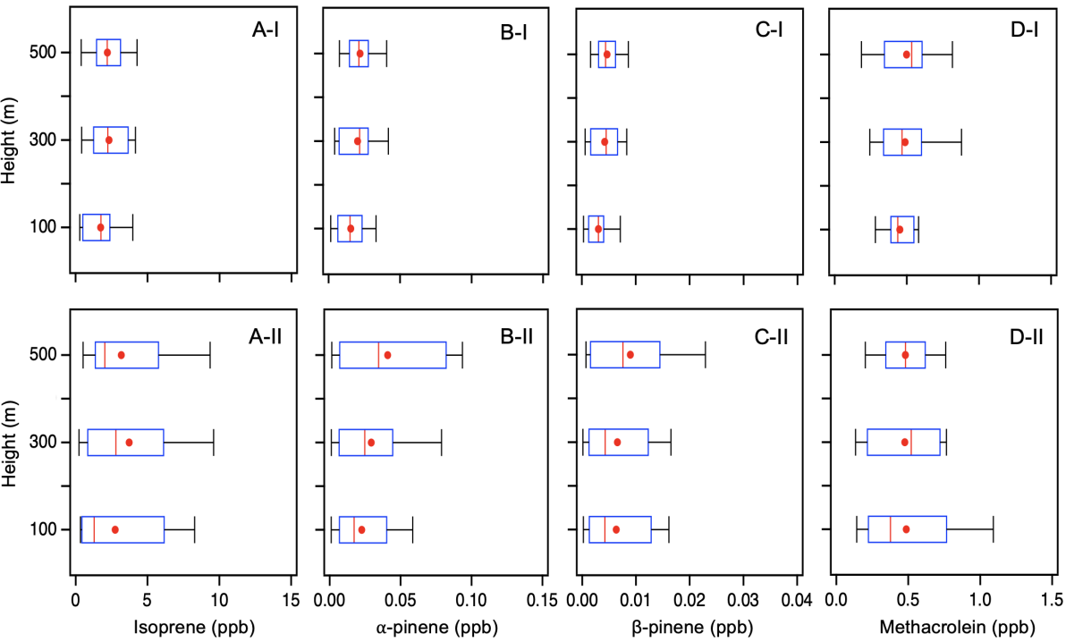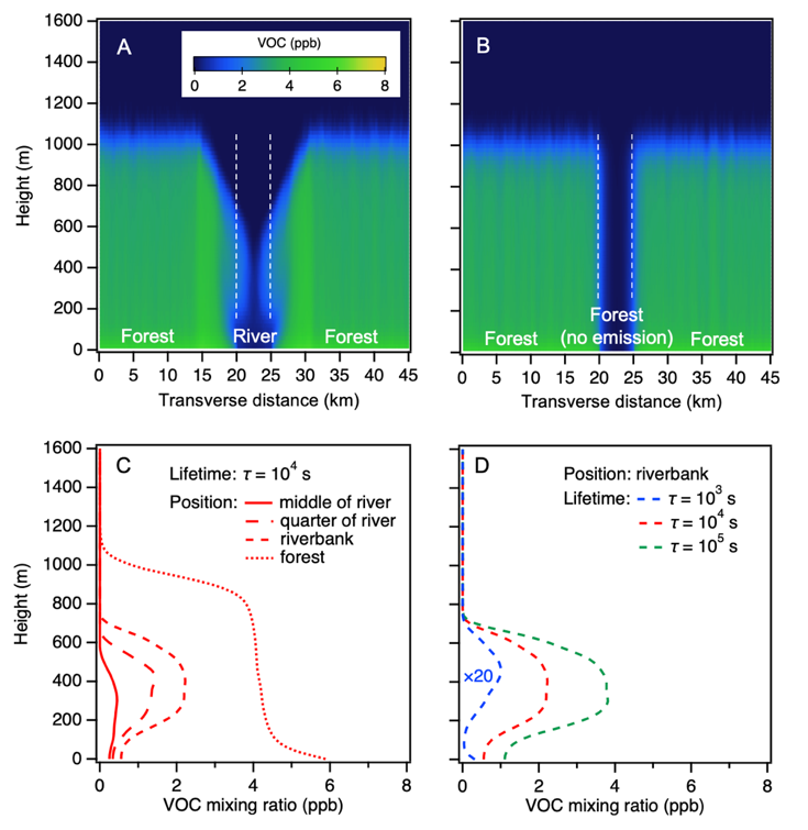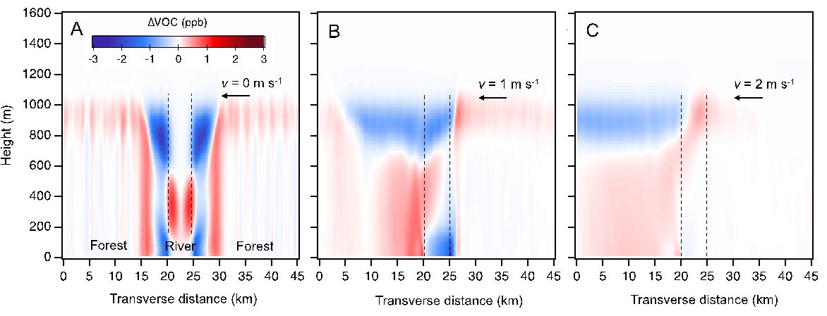 区别于毗邻森林地区,在河风作用下,河流上空VOC亦呈特征性垂直分布。大涡模拟结果表明,河风期间,VOC浓度最大值出现在河流上空200-500 m(图3)。这与无人机观测结果一致(图2,500 m处VOC的浓度比100 m处的浓度可高出80%),也与在该观测点500 m高空的飞机飞行航测数据分析一致(详见论文第3.1部分)。