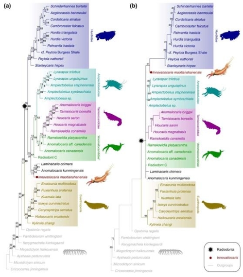 图3.该研究得到的奇虾类系统发生树,分别为简约法(a)和贝叶斯推断(b)的结果,示帽天山开拓虾(Innovatiocaris maotianshanensis)的演化位置