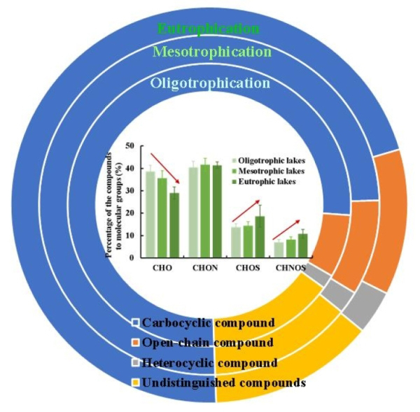 结果表明,富营养化使水体DOM分子构成中的CHO%含量减少,含硫元素的杂原子化合物(CHOS%和CHNOS%)含量增加;富营养化湖泊中夏季水体DOM的分子稳定性要高于秋季,这与浮游植物群落的季节性演替有关;富营养化水体中,DOM的主要组分为高度不饱和化合物、O3S+O5S化合物和富羧基脂环化合物(CRAMs),这是内源DOM(浮游植物衍生)被进一步生物转化的产物,湖泊富营养化可能会导致水体中难降解的DOM化合物逐渐增多。目前全球范围内水体富营养化现象逐渐加剧,该研究为阐明湖泊DOM在未来全球碳循环中的作用提供了重要的理论支撑。