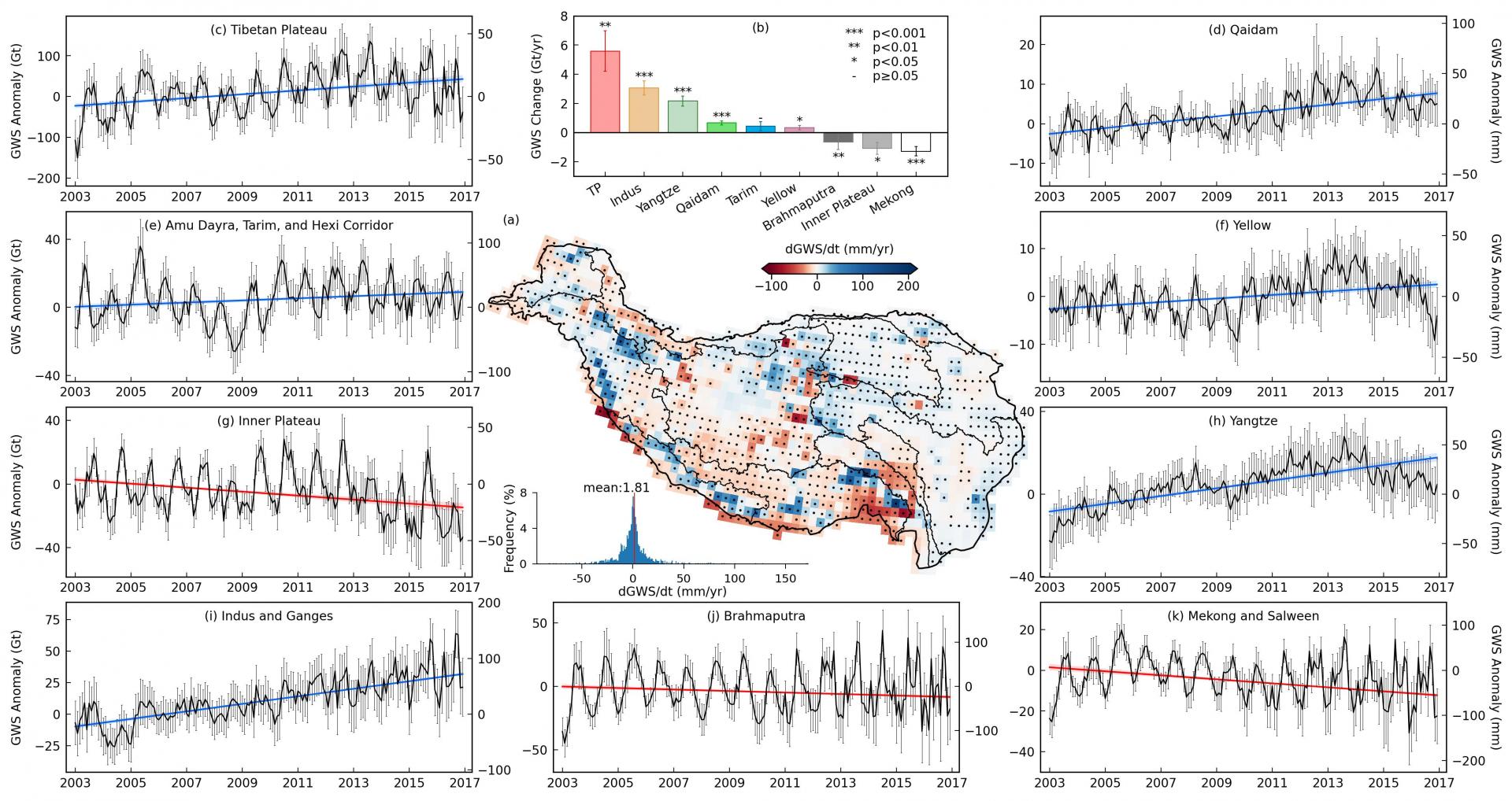 、图1. 青藏高原及其子流域2003至2016年地下水储量的时空变化