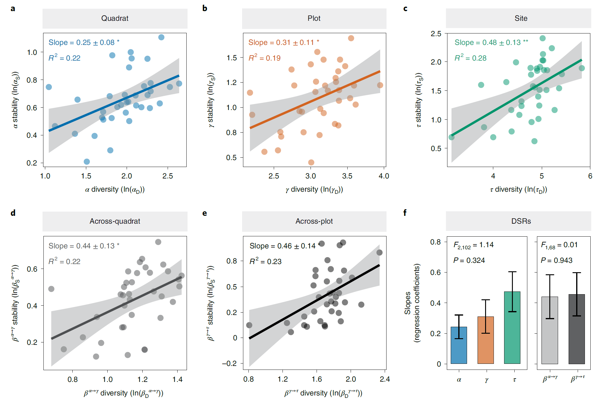 图2. 不同尺度的多样性-稳定性关系(A-E),以及这一关系的强度随空间尺度的变化(F)