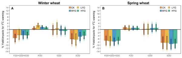 图1.冬小麦和春小麦不同品种对增温1℃的产量响应。CK:对照品种,LYG:低产品种,MYG:中产品种,HYG:高产品种;FDD:极端冷积温,GDD:生长积温,EDD:极端热积温。