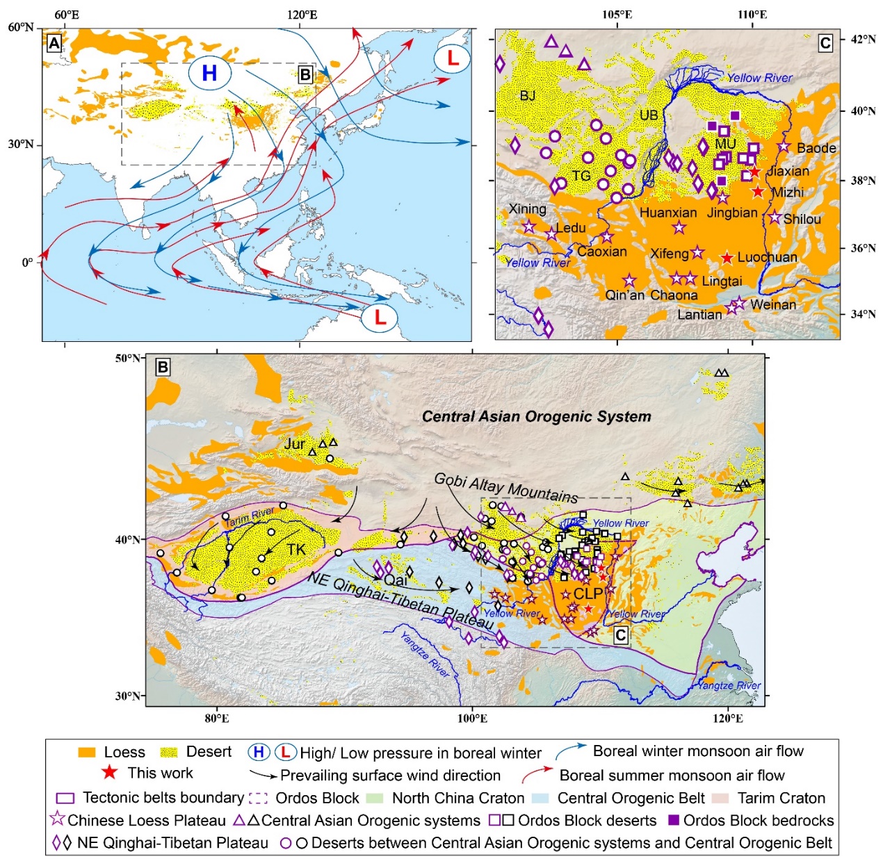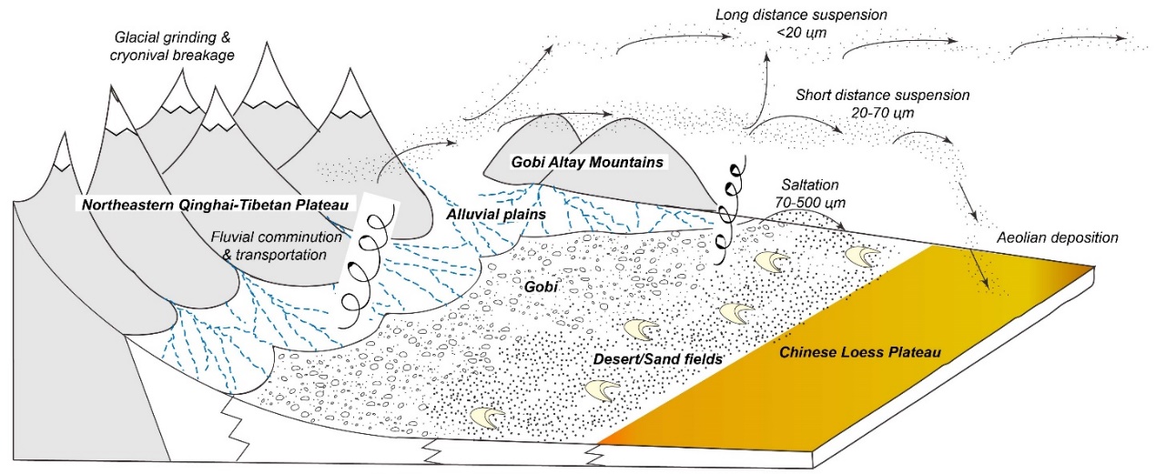 图1. 黄土高原的位置及其与潜在的物源区的联系。其中,橙黄色区域是黄土堆积区